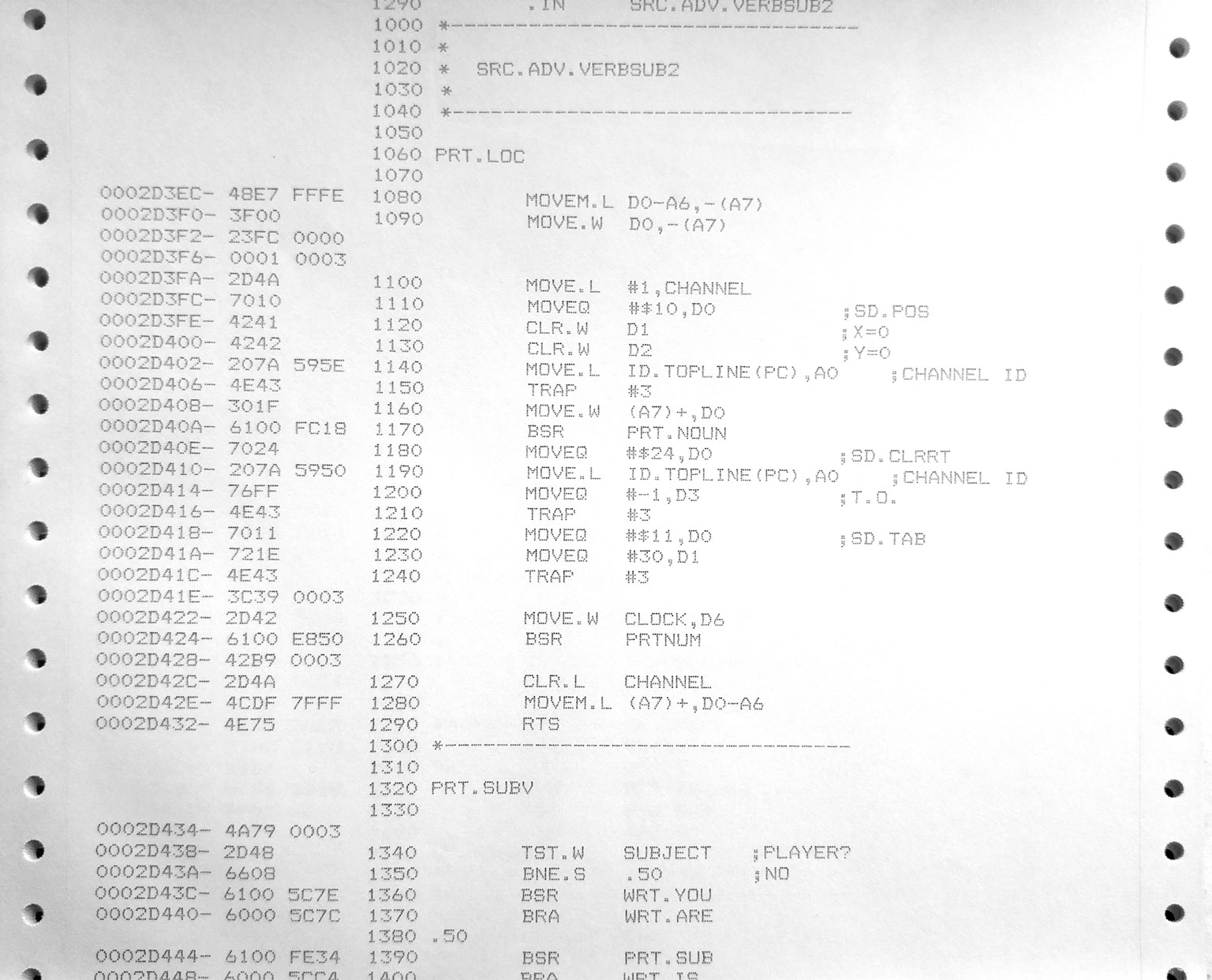 Back in the 80's, a lot of games were written in assembler. Here's a listing of Magnetic Scrolls' "The Pawn" from 1984. It's a fair chunk of paper!