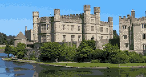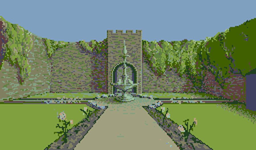 The top picture is a hand-drawn image from The Guild of Thieves, and the one below it is a photo that's been scaled down and reduced to 16 colours (including black). Actually, the photo isn't too bad, although it's considerably noisier than the drawing. Real photos also contain too much clutter to be effective at low resolutions. For example, here we would be better off without those trees (like in the drawing).